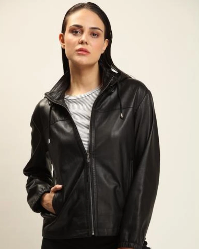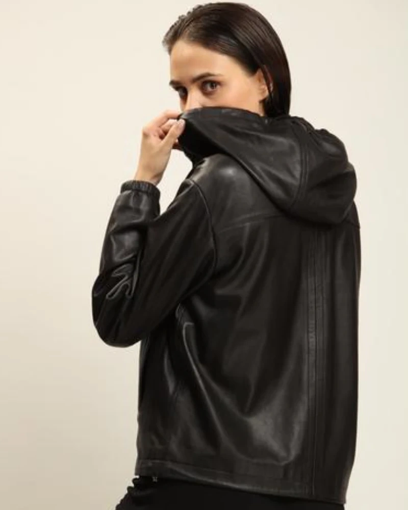 Black Lambskin Leather Jacket With Detachable Hood For Women