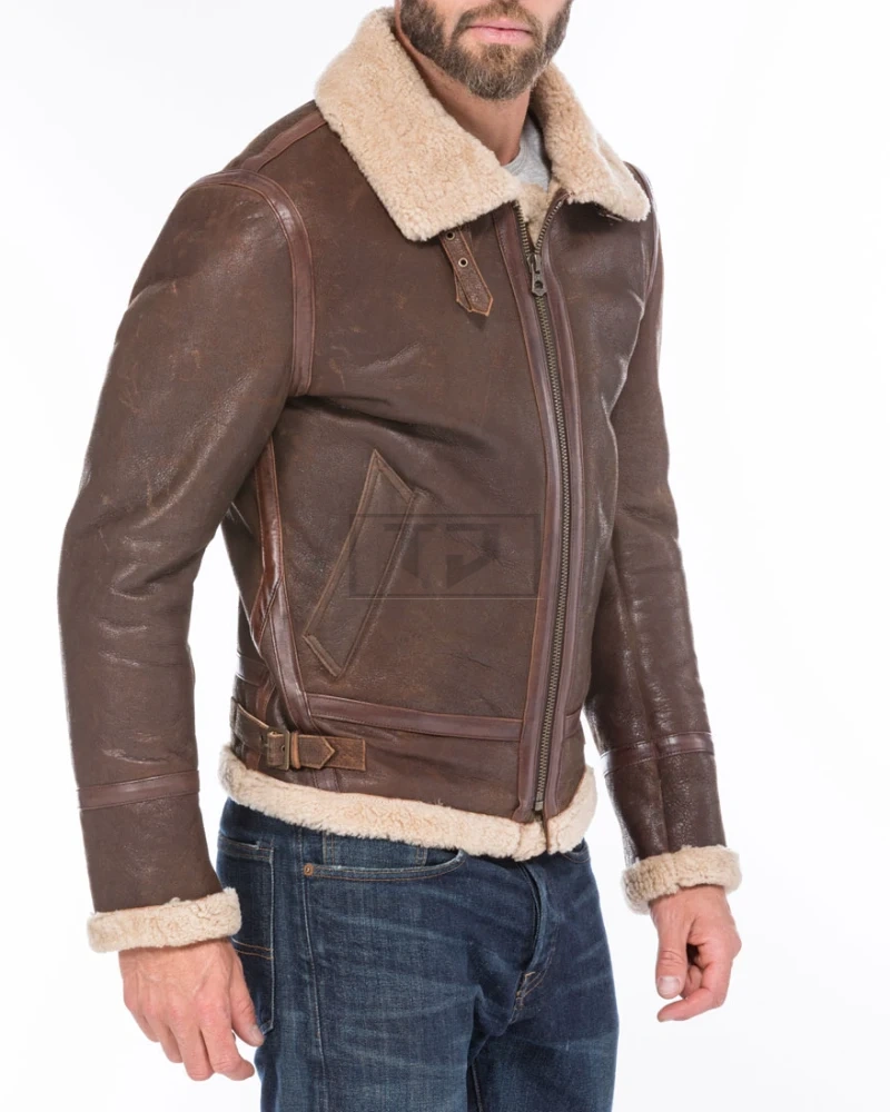 Mens Bomber Shearling Brown Sheepskin Leather Jacket - image 3